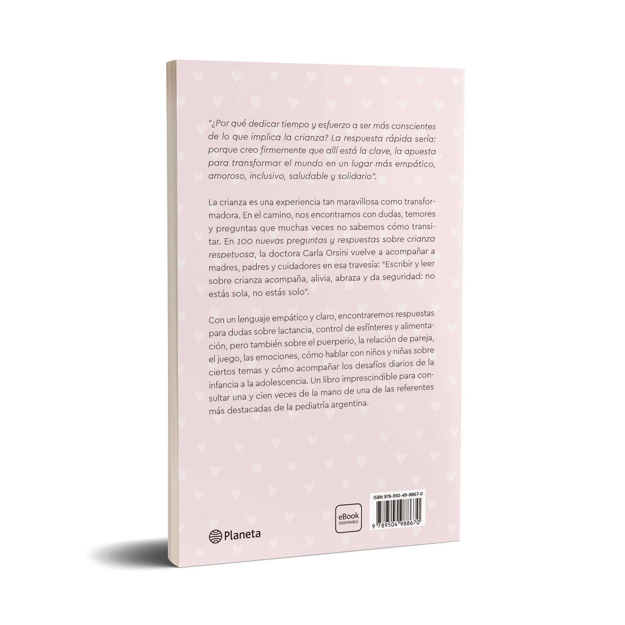 La crianza es una experiencia tan maravillosa como transformadora. En el camino, nos encontramos con dudas, temores y preguntas que muchas veces no sabemos cómo transitar. En 100 nuevas preguntas y respuestas sobre crianza respetuosa, la doctora Carla Orsini vuelve a acompañar a madres, padres y cuidadores en esa travesía: “Escribir y leer sobre crianza acompaña, alivia, abraza y da seguridad: no estás sola, no estás solo”.