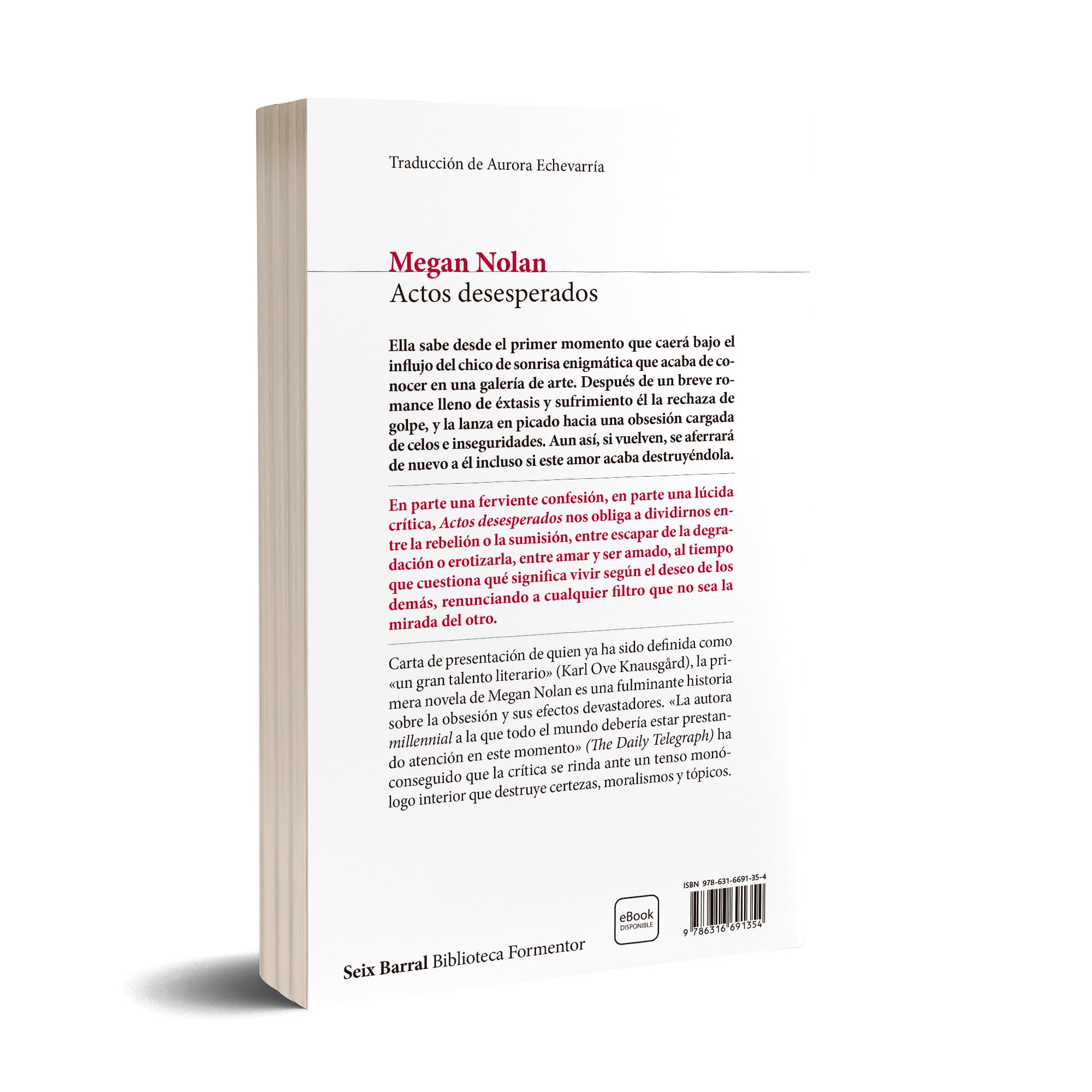 «Nolan es un gran talento literario y su primera novela, una historia de amor como ninguna otra.» Karl Ove Knausgård «La escritura cruda y asombrosamente perspicaz de Nolan brilla de tal manera que arrojará nueva luz sobre las heridas, tanto las sanadas como las abiertas, y posiblemente evitará que otra mujer sin nombre sufra. Habla claramente de la obsesión y la despoja de todo atractivo.» The New York Times Book Review La joven narradora de esta provocadora novela conocerá a un magnético escritor llamado Ciaran y caerá, en contra del sentido común, completamente bajo su influjo. Después de un breve romance que lo consume todo él la rechaza abruptamente, enviándola en picado hacia una obsesión cargada de celos e inseguridades. Si alguna vez se decide a volver con ella, se ha prometido que se aferrará de nuevo a él y a su amor a toda costa, incluso si eso acaba destruyéndola. En parte una confesión sin aliento, en parte una crítica lúcida, Actos desesperados hace que la conciencia se divida entre la rebelión y la sumisión, entre escapar de la degradación y erotizarla, entre amar y ser amado, al tiempo que cuestiona la naturaleza de la fantasía, el deseo y el poder, desafiándonos a reconocer honestamente nuestra propia insaciabilidad. Carta de presentación de 'un gran talento literario' (Karl Ove Knausgaard), el fascinante debut de Megan Nolan es una fulminante anti-historia de amor sobre la obsesión y sus efectos devastadores.