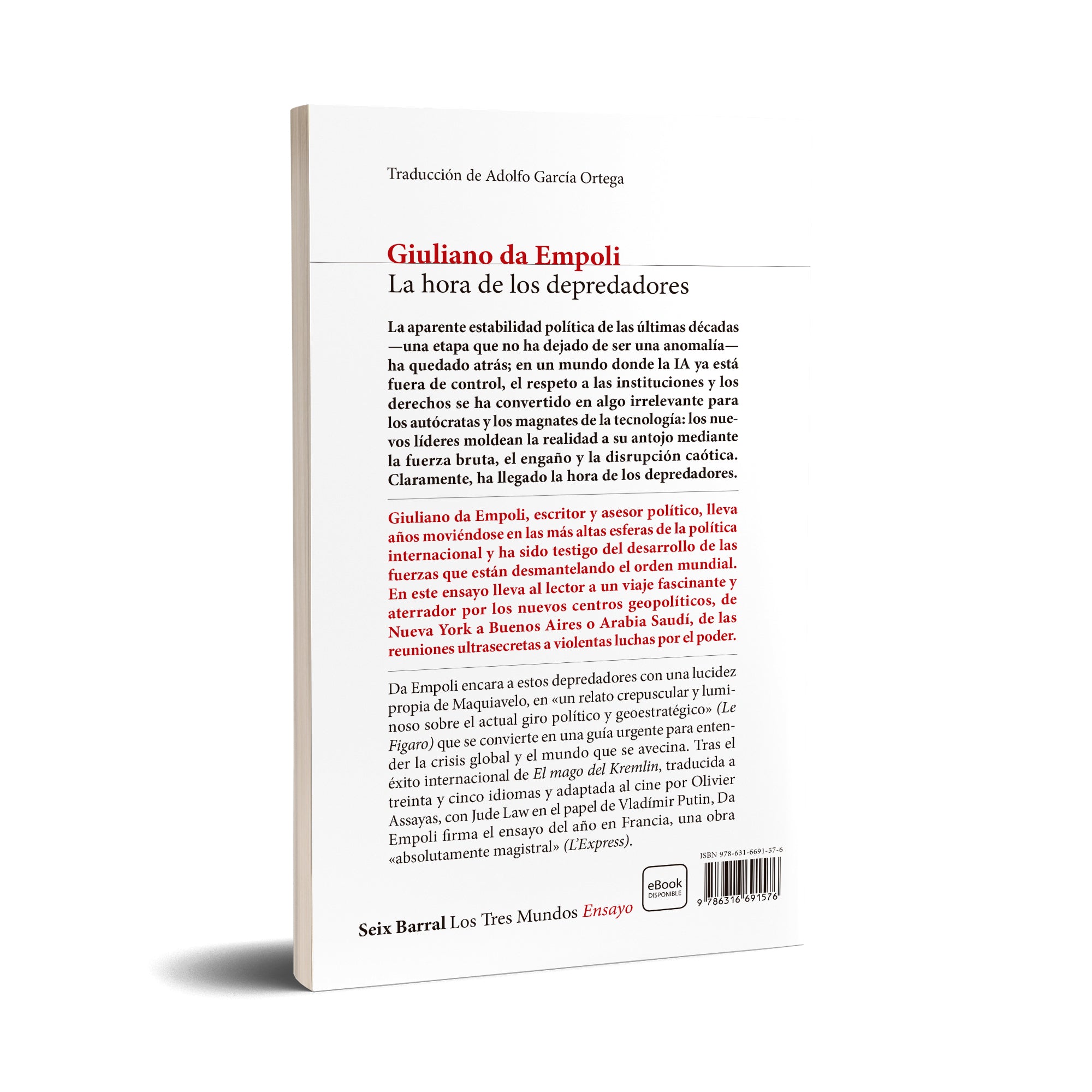 «Un relato crepuscular y luminoso sobre el actual giro político y geoestratégico.» Le Figaro «Un fresco apasionante de los César Borgia del mundo contemporáneo.» Le Monde «En La hora de los depredadores todo es verdad, todo es una locura.» Paris Match La aparente estabilidad política de las últimas décadas 'una etapa que no ha dejado de ser una anomalía' ha quedado atrás, en un mundo donde la IA ya está fuera de control, el respeto a las instituciones y los derechos se ha convertido en algo irrelevante para los autócratas y los magnates de la tecnología: los nuevos líderes moldean la realidad a su antojo mediante la fuerza bruta, el engaño y la disrupción caótica. Claramente, ha llegado la hora de los depredadores. Giuliano da Empoli, escritor y asesor político, lleva años moviéndose en las más altas esferas de la política internacional y ha sido testigo del desarrollo de las fuerzas que están desmantelando el orden mundial. En este ensayo lleva al lector a un viaje fascinante y aterrador por los nuevos centros geopolíticos, de Nueva York a Buenos Aires o Arabia Saudí, de las reuniones ultrasecretas a violentas luchas por el poder. Da Empoli encara a estos depredadores con una lucidez propia de Maquiavelo, en «un relato crepuscular y luminoso sobre el actual giro político y geoestratégico» (Le Figaro) que se convierte en una guía urgente para entender la crisis global y el mundo que se avecina. Tras el éxito internacional de El mago del Kremlin, traducida a treinta y cinco idiomas y adaptada al cine por Olivier Assayas, con Jude Law en el papel de Vladímir Putin, Da Empoli firma el ensayo del año en Francia, una obra «absolutamente magistral» (L'Express).